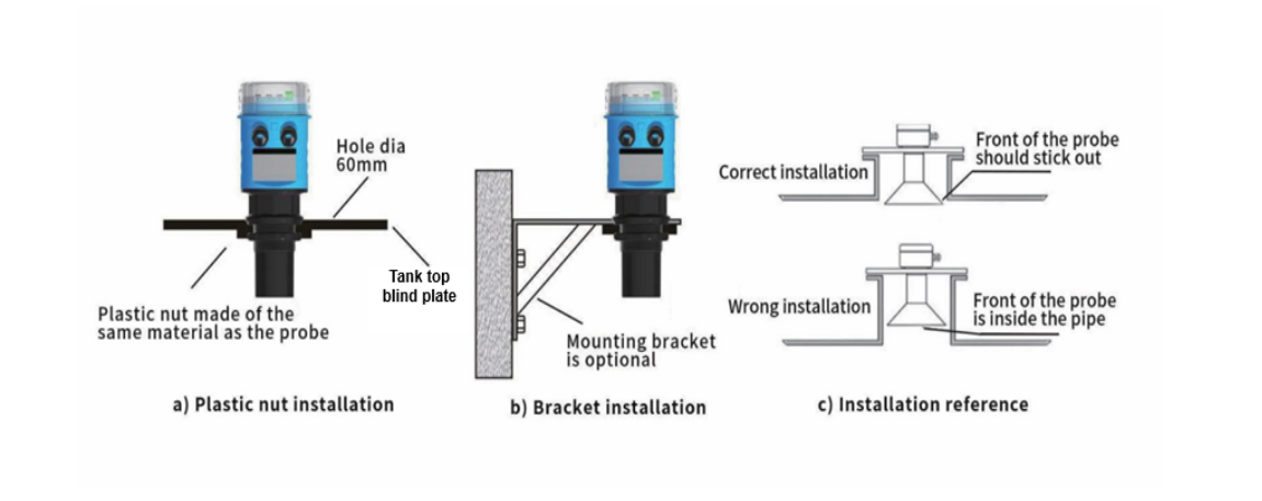 La sonda deve essere installata al di sopra del livello massimo del liquido per evitare gli schizzi.
